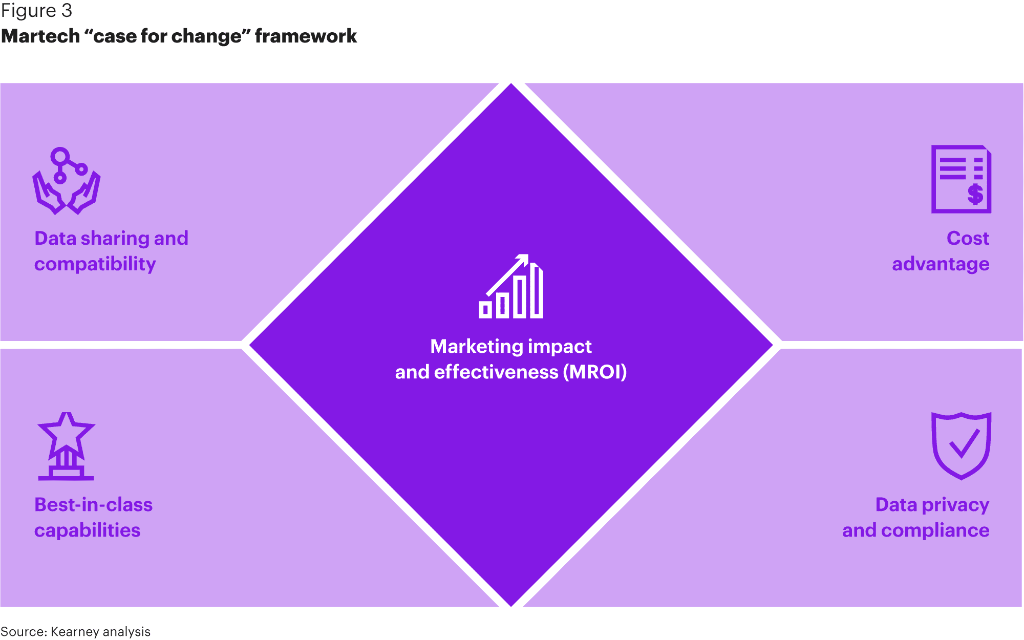 Kearny proposes a new “case for change” framework with ROI at the center of the though process of how to think about prioritizing your martech stack build and getting the most out of it: